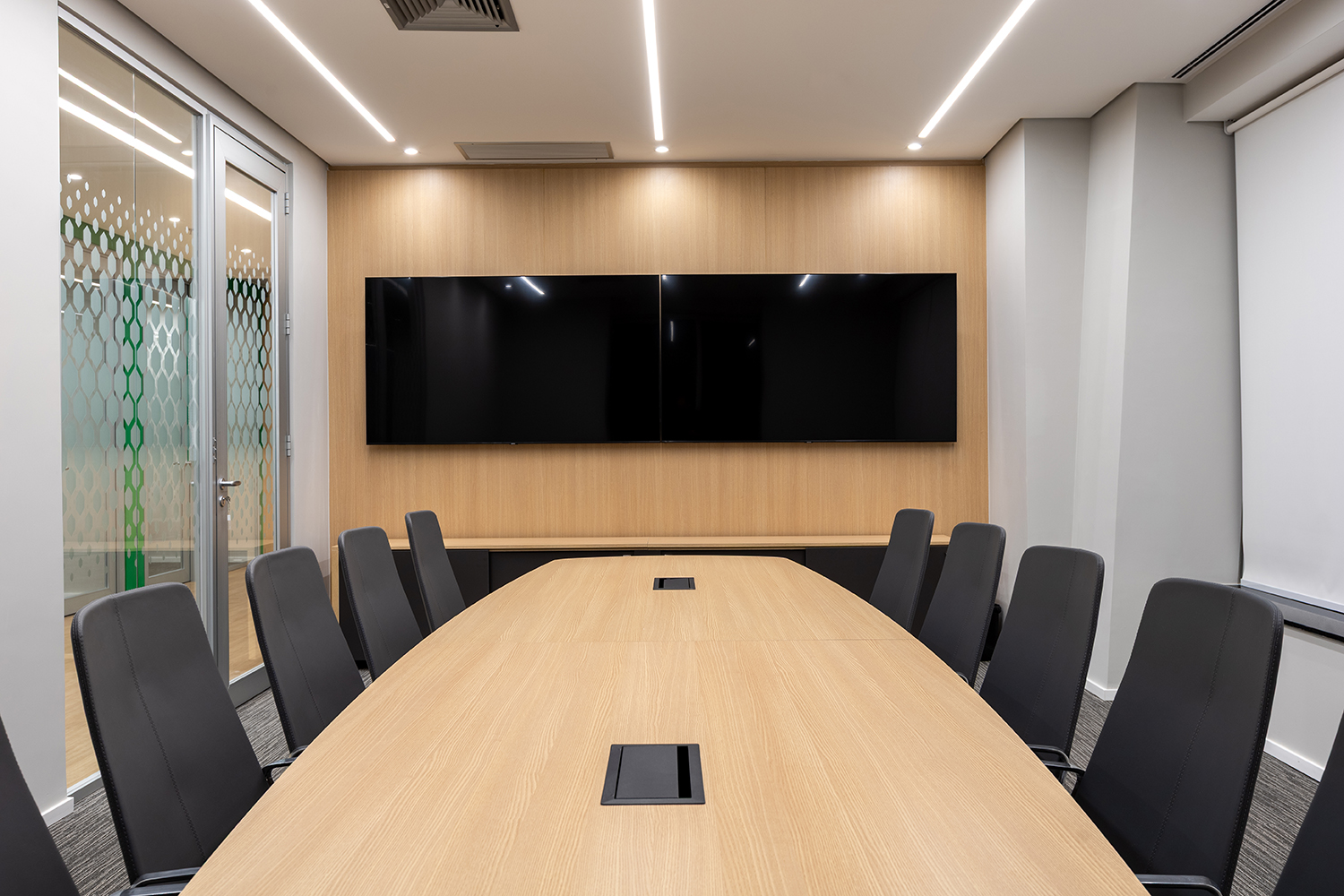 O novo escritório da Reply destaca-se pelas cores vibrantes e pela aplicação consistente da identidade visual da marca. Na recepção, o painel metálico retroiluminado é o protagonista, refletindo de forma marcante o branding da empresa. A área de staff combina piso vinílico nas circulações e carpete nas baias, enquanto a biofilia aparece em uma árvore preservada na mesa de reuniões informais.